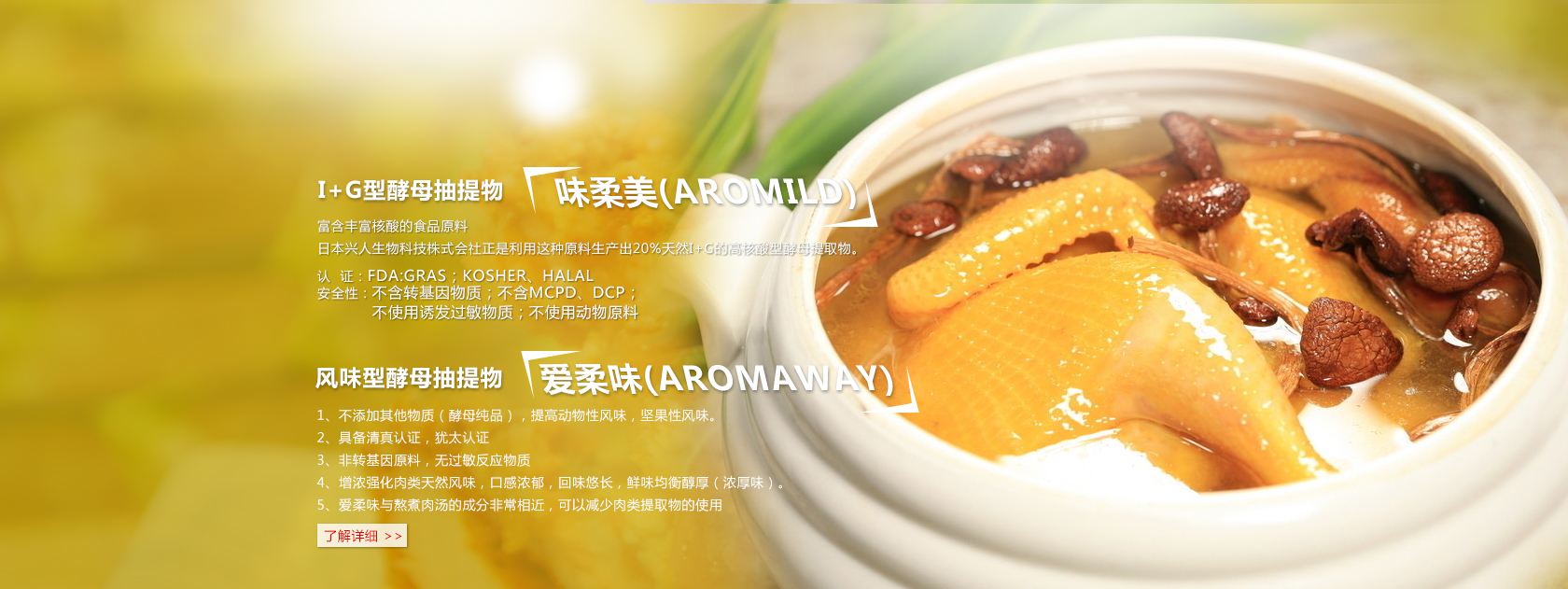 水解動(dòng)植物蛋白系列(HVP&HAP) 復(fù)合調(diào)味料系列--酵母精、酵母抽提物 復(fù)合調(diào)味料系列--鮮味基礎(chǔ)調(diào)味料 復(fù)合調(diào)味料系列--海鮮風(fēng)味 復(fù)合調(diào)味料系列--畜禽風(fēng)味 復(fù)合調(diào)味料系列--和風(fēng)調(diào)味料 復(fù)合調(diào)味料系列--口酷味 復(fù)合調(diào)味料系列--餐飲外食 味淋料酒 可得然凝膠G 面包預(yù)拌粉 面包改良劑